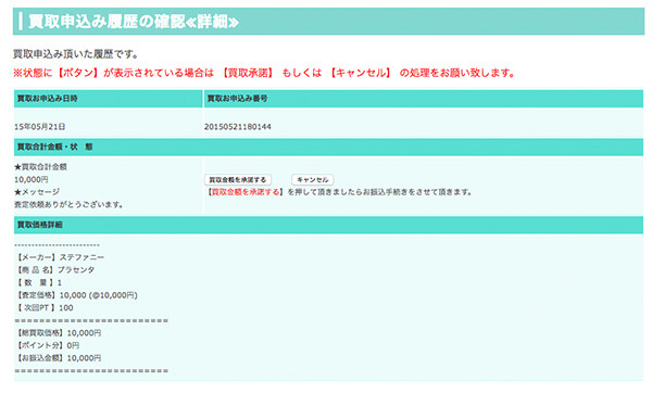 お申込み番号をクリックして頂くとお取引の詳細が表示されますので、買取金額をご確認の上【買取金額を承諾する】を押して頂き小窓が開いたら【OK】を押して下さい。